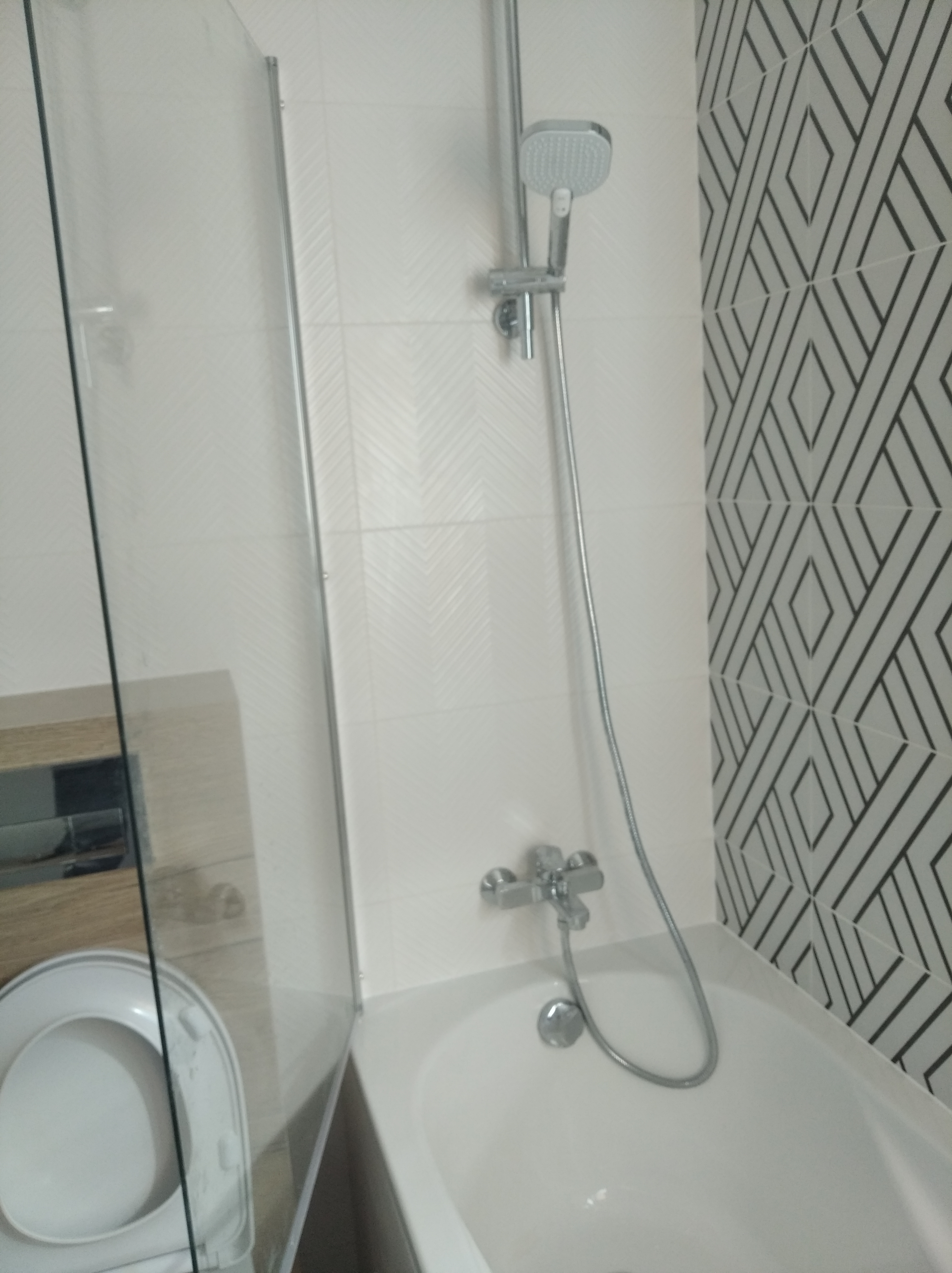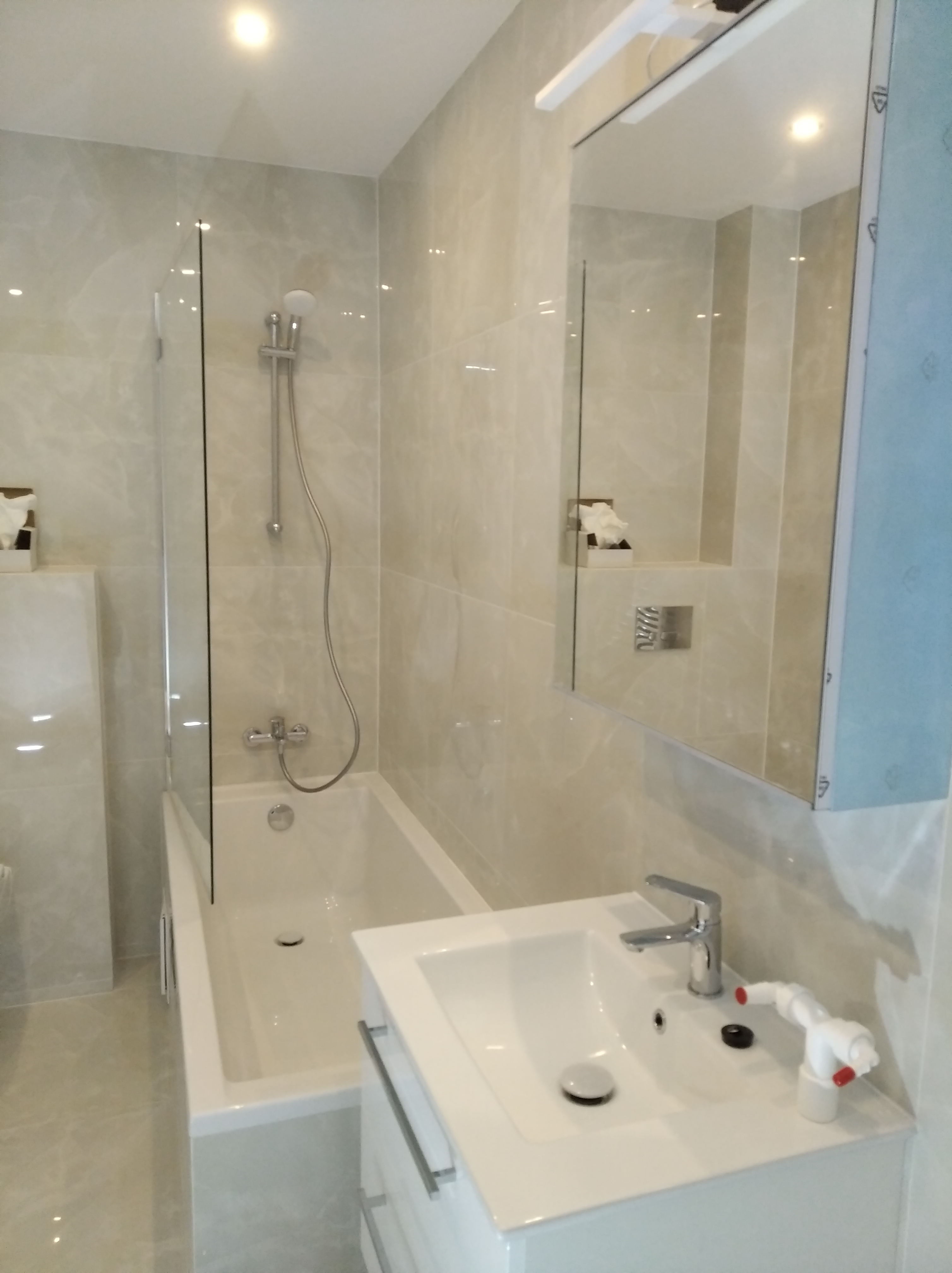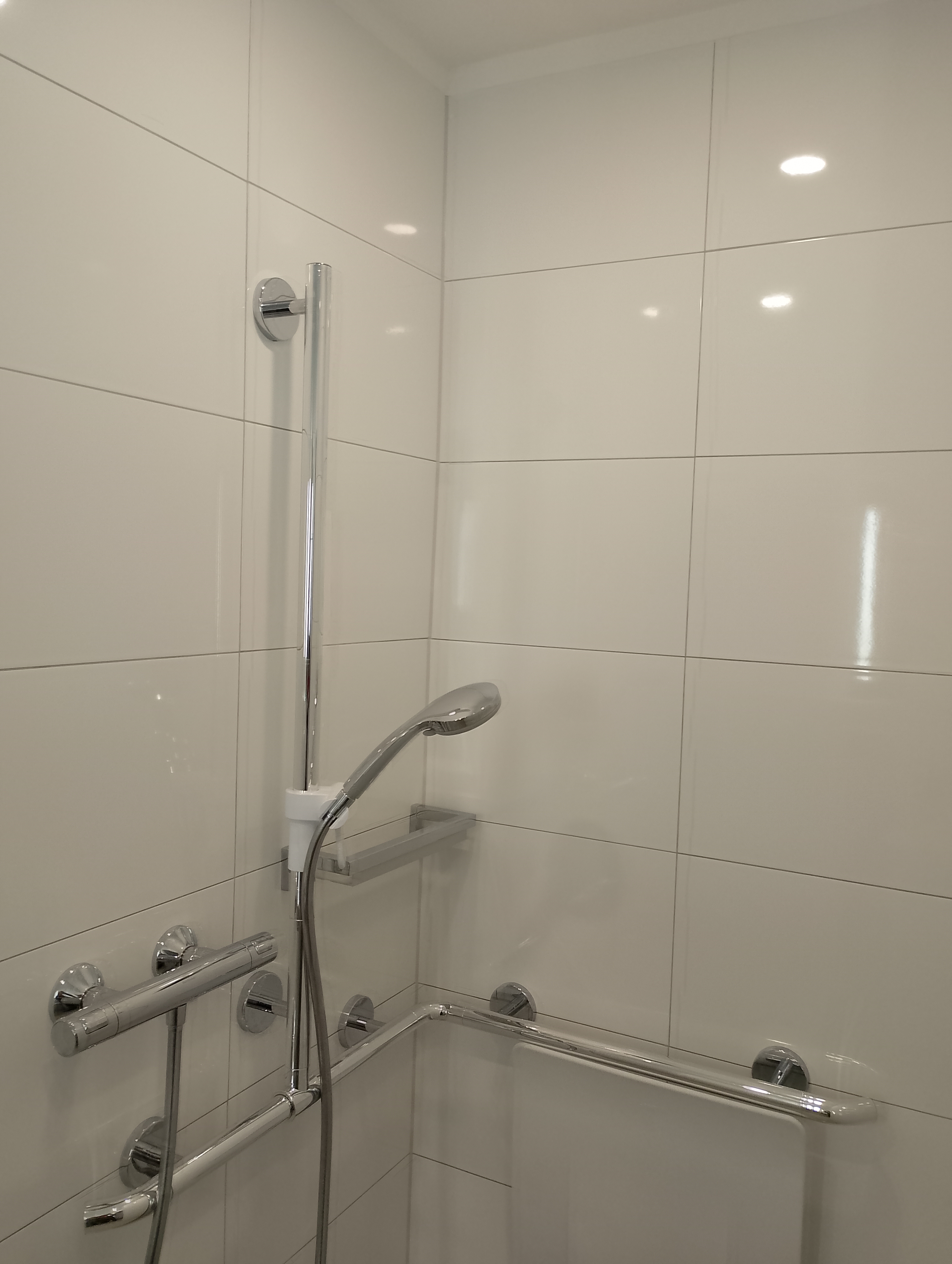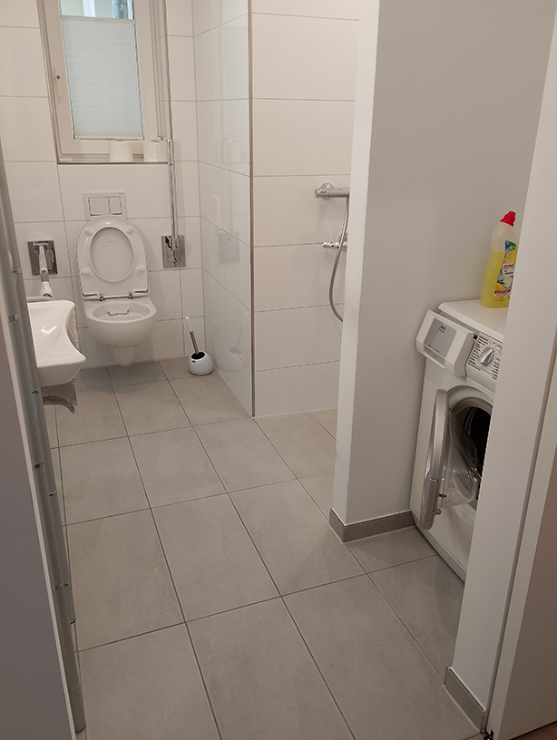 Das Badezimmer ist mit zahlreichen Haltegriffen ausgestattet, angepasst an die Bedürfnisse behinderter Menschen. Die Küche wurde mit neuen Möbeln ausgestattet. Die gesamte Wohnung ist weiß gestrichen und der Boden ist mit Vinylpaneelen ausgelegt.