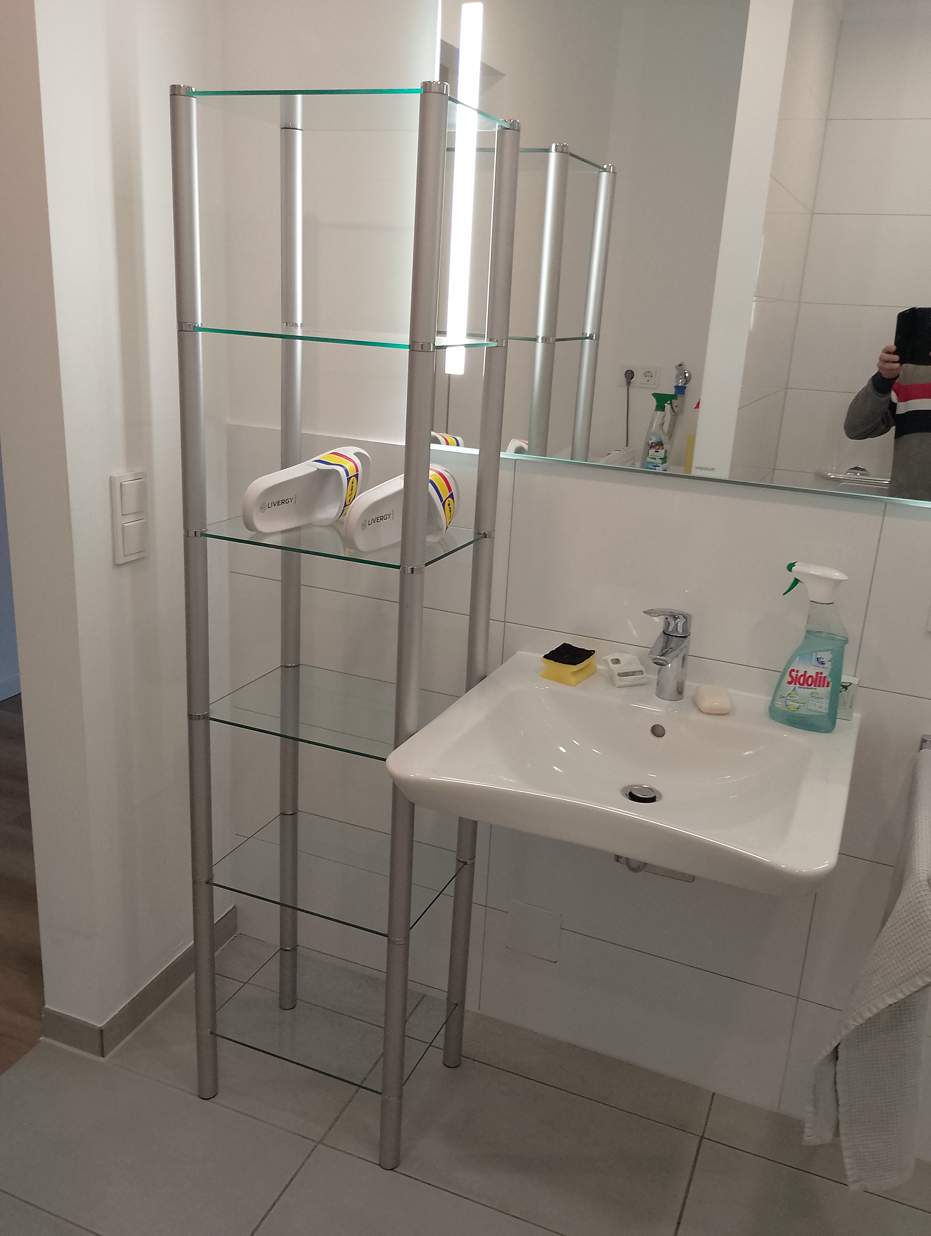 Helle Fliesen an den Wänden (60x60), zusätzlich schmale Fliesen in Holzoptik in der Kabine. Grauer Boden 60x60. Das Ganze ist mit schwarzen Accessoires und Geräten geschmückt. Zusätzlich haben wir in der Nische eine beleuchtete Regalkonstruktion aus Möbelplatten realisiert.